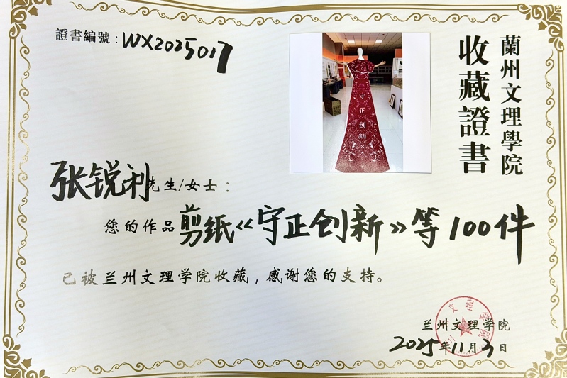 张锐利一直致力于非遗传承的创造性转化、创新性发展。她在参观我校非遗知识馆时,发现馆内庆阳特色非遗展示不足,更牵挂如何让大学生亲近非遗,便萌生捐赠想法。“这100多件作品是我20多年的珍藏,有香包、窗花、皮影这些,每一件都有手艺人的温度。”她强调,捐赠初衷是想给学生搭平台,“希望他们能触摸到传统技艺的质感,对庆阳非遗产生兴趣,愿意去了解、去学,让老手艺在年轻一代里活起来”。其中,她创作的“守正创新”主题披肩式剪纸别具特色,现陈列于我校非遗知识馆,吸引众多参观者驻足。