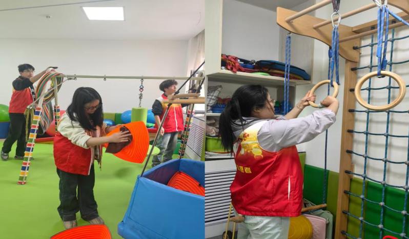 志愿者们在特教老师的指导下分工开展服务。部分志愿者对教室、活动室等区域进行全面清洁,清扫场地、擦拭教具、整理玩具物品,细致清理卫生死角,为孩子们打造整洁安全的学习生活环境;另一部分志愿者与孩子们温柔互动,耐心陪伴交流,让孩子们在温暖的氛围中感受社会关怀。